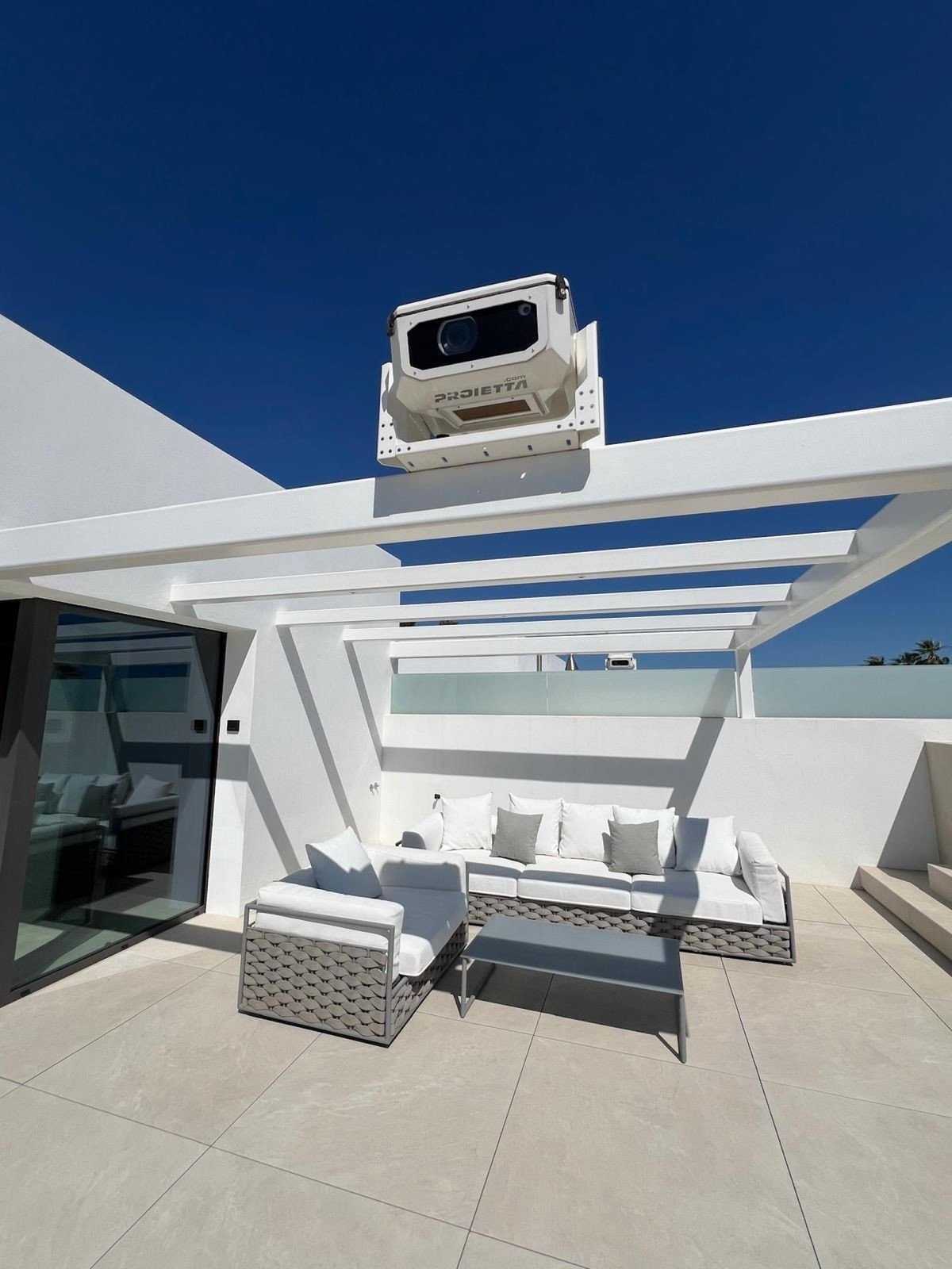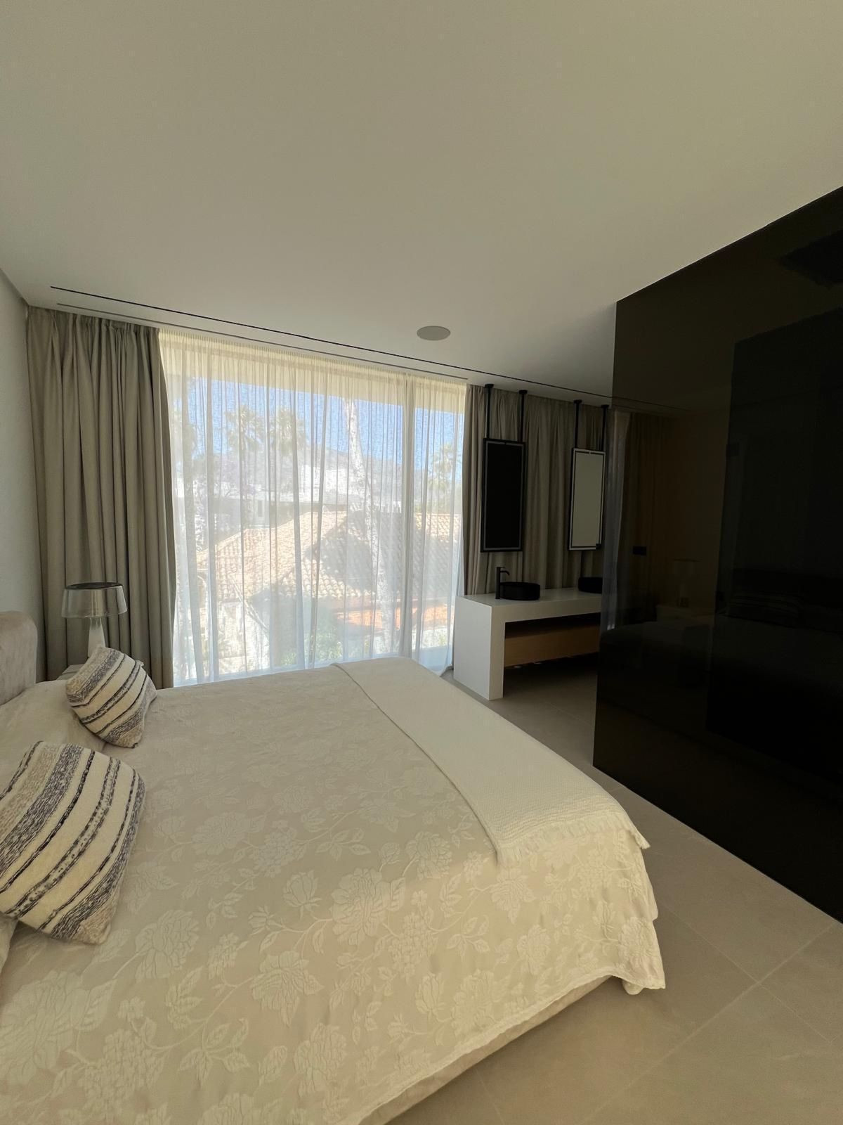 Brand new Villa located in a heart of Nueva Andalucia, Marbella. Walking distance to Puerto Banus and all amenities, close to Aloha Golf Club & Las Brisas Golf Club, and just 1,5 km from the beach. Houses were built in 2024. The residential is completely gated and private, counting with a spectacular entrance, which gives access to 6 impressive “Vilas” with state-of-the-art design. Within the entrance we can find the reception and the security guard post. The extensive outdoor spaces and gardens around the “Vilas”, give way to a new concept of swimming pool of almost 180 m2 plus a 36 m2 children’s pool, both with chlorination water treatment. The beautifully built Villa on 4 levels offers high quality, stylish and bright living room open to the large and elegant terrace. All 3 bedroom suites include floor-to-ceiling windows, a sleek minimalist kitchen. All 4 levels are connected by a modern elevator. Terraces leading out to a private area of garden – as well as having access to the beautifully landscaped communal gardens and swimming pool. Roof terrace with private swimming pool and outdoor cinema. A customizable basement provides ample space for a home gym, an additional bedroom or room for any other use, such as an office. Villa 6.6 has a parking space for 4 cars within the communal underground parking area. Due to its orientation and position, the entire complex enjoys natural light most of the day, and Villa is completely filled of luminosity through its incredible windows as well as through the “Central courtyard”. It is also a fact that the residents will be able to enjoy the most incredible sunrises and sunsets from the spacious terraces.
