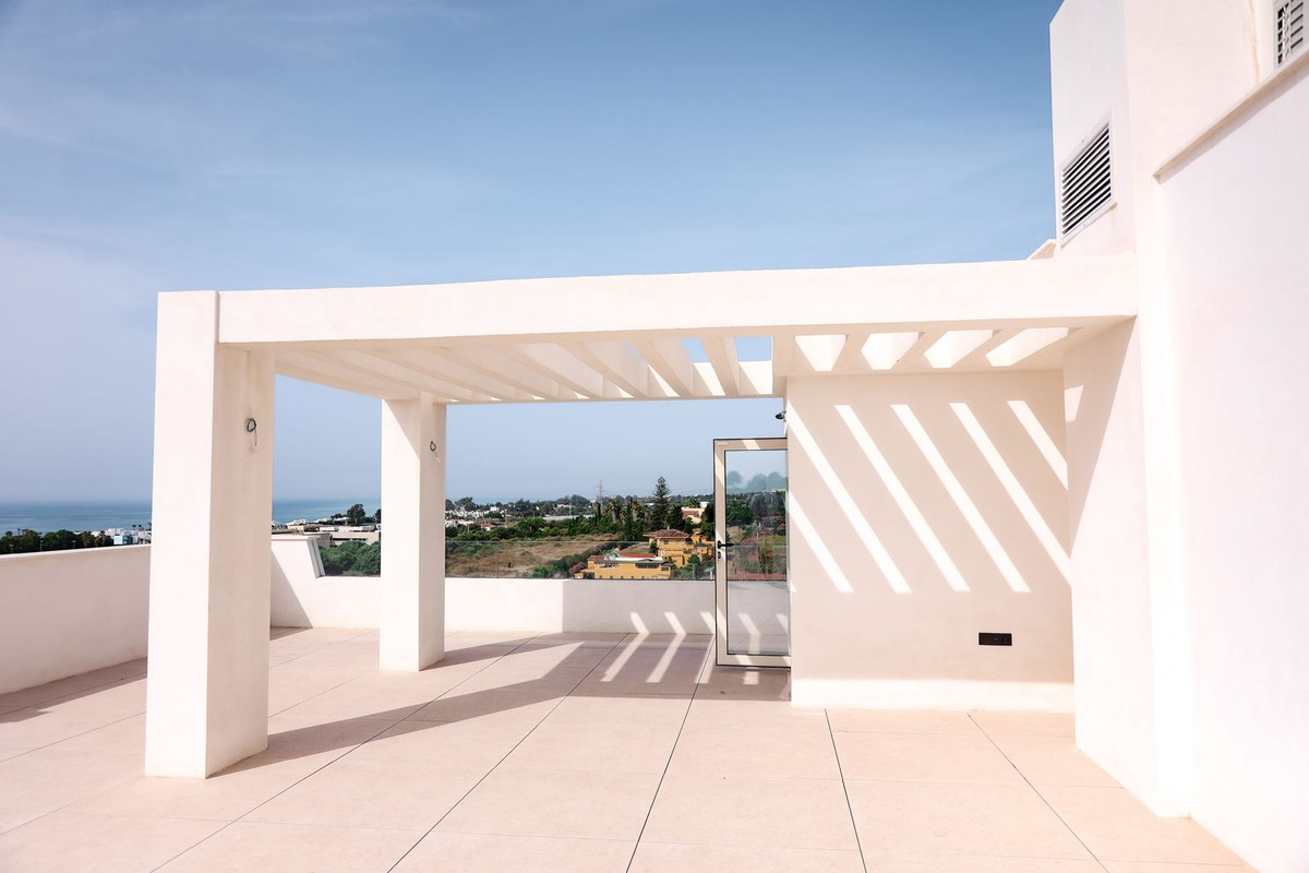 This elegant duplex penthouse with stunning sea views is located in one of the most promising areas of the Costa del Sol. Just minutes from the beach, it offers a strategic location that combines peace and privacy with excellent access to Estepona, Marbella, and all essential services. It is also very close to top international schools, including the prestigious Atlas American School. The property is spread over two floors and features a smart layout with double terraces on the main level: one offering open sea views, and the other overlooking the mountains and the communal pool. The bright and spacious living-dining area is filled with natural light, complemented by three bedrooms, all with direct access to the terraces, and two full bathrooms. Upstairs, a private rooftop solarium offers spectacular panoramic sea views — the perfect space to relax or entertain outdoors. Built with top-quality materials and premium finishes, this penthouse stands out for its brightness, privacy, and energy efficiency, thanks to an advanced aerothermal system. It includes a private double garage and storage room. A unique new-build property that combines smart design, modern features, and an unbeatable location — ideal as a permanent residence or as a solid investment in a high-growth area.