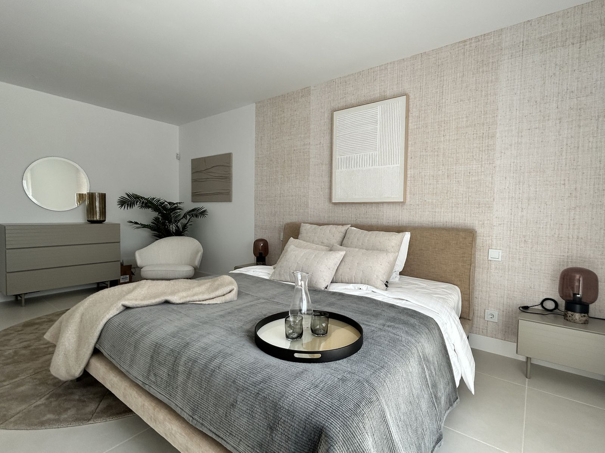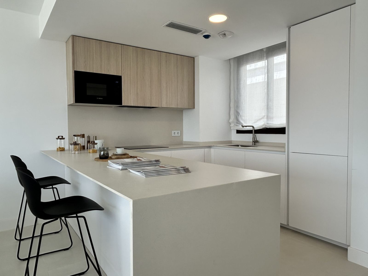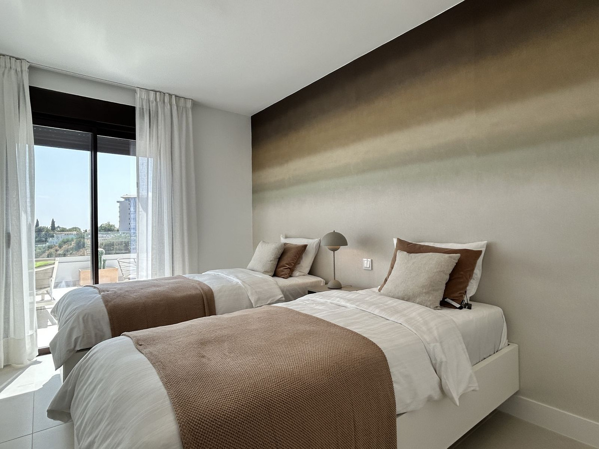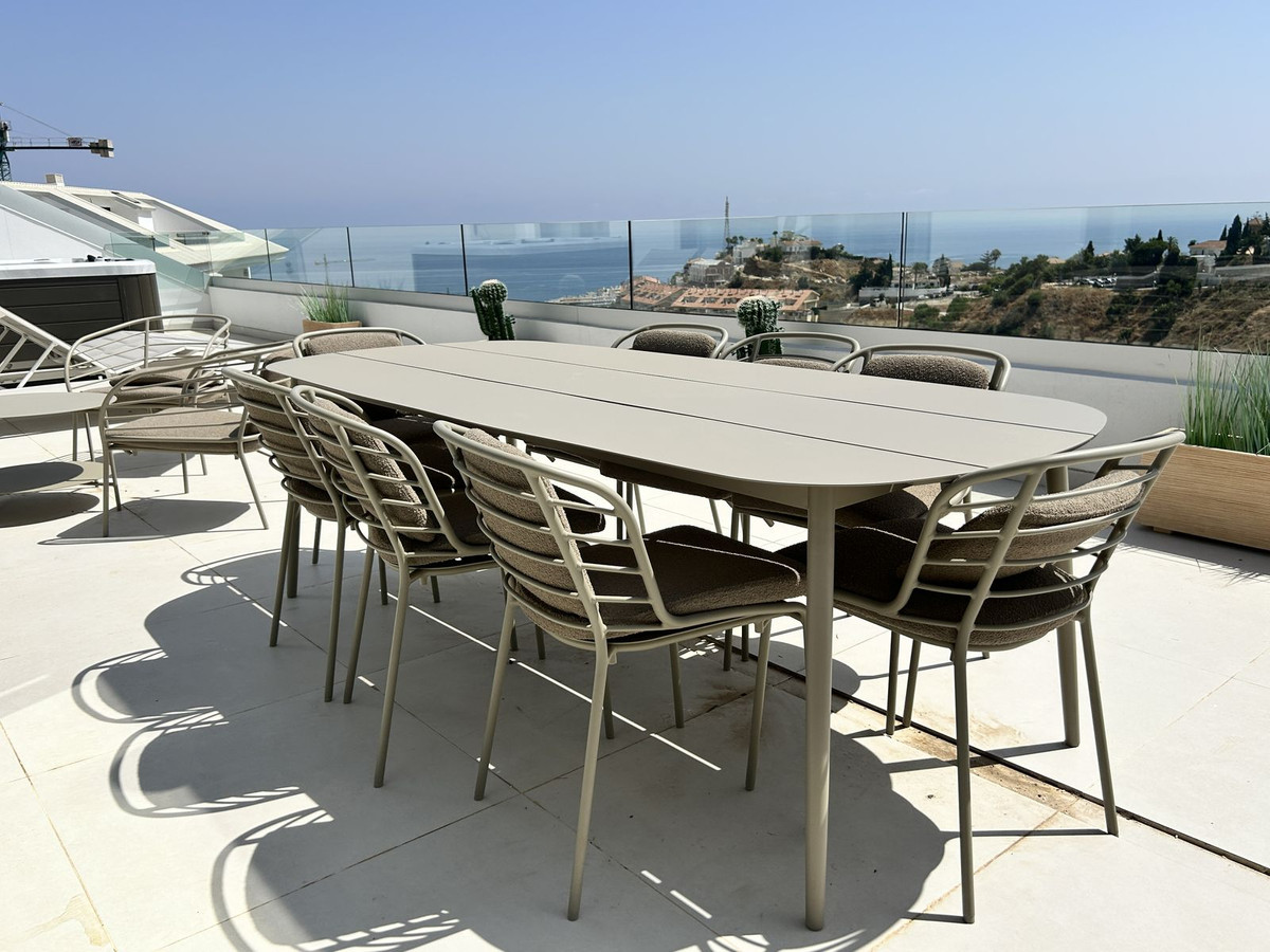 New exclusive 3-bedroom penthouse for sale with panoramic sea views and a south-facing location to enjoy sunlight, privacy, and uninterrupted views all day long. Located in the exclusive residential area of Higuerón, Fuengirola, it offers over 100,000 m² of gardens, several outdoor pools, a solarium, a jacuzzi, and a children's area; a true Mediterranean paradise in full expansion, surrounded by nature and perfectly connected. The property comes fully furnished with high-end designer pieces and a comprehensive interior design project by Ikonia Ilusion&Arte, combining selected furniture, lighting, and contemporary tones to maximize the feeling of spaciousness. The living room and kitchen share an open space that extends onto the spacious terrace through large, high-performance sliding windows, creating a seamless connection between the interior and exterior. Its features include an air-source heat pump system for heating and cooling, underfloor heating in bathrooms, aluminum/PVC exterior carpentry with double thermoacoustic and security glazing, and pre-installed motorized blinds in the bedrooms and living room. The home incorporates home automation with smoke and water leak detection, TV sockets in the living room, bedrooms, and terrace, and Jung mechanisms. The kitchen, equipped with wall and base units, a Silestone countertop, and paneled appliances with an A-grade energy efficiency rating, includes a stovetop, oven, microwave, hood, refrigerator, dishwasher, and washer-dryer. The bathrooms feature wall-hung toilets, extra-flat shower trays with screens, and, in the master bathroom, a double sink with integrated cabinetry. Large-format porcelain flooring extends throughout the home. 2.10 m interior doors, clad built-in wardrobes, and glass railings on the terraces provide elegance and security. The complex emphasizes sustainability with thermal insulation and pre-installation for an electric vehicle charger. Two parking spaces are included, and a storage room is available subject to availability. A turnkey option to experience the Mediterranean from day one and make a high-value investment in a premium location. The buyer is exempt from agency fees. Expenses arising from the purchase process, such as notary fees, registration fees, or transfer taxes, are not included in the price.