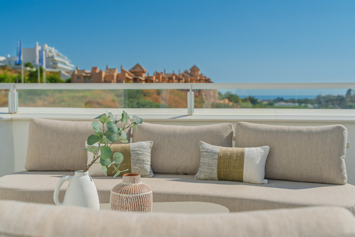 Discover this stunning second-floor duplex penthouse, offering breathtaking panoramic views of the sea and mountains. The home features a spacious living room terrace and a rooftop terrace with a private solarium and elegant white pergola, perfect for enjoying the Mediterranean sun in complete privacy. The penthouse includes three bedrooms and three bathrooms, a private parking space, and a storage room, ensuring comfort and convenience for the whole family. Residents can enjoy a beautiful communal pool to relax and soak up the sun. The exclusive La Familia clubhouse provides access to a restaurant, indoor swimming pool, and gym. The complex itself also offers a gym and coworking space, combining luxury living with modern lifestyle amenities. Centrally located in Estepona, the property is just 5 minutes by car from the beach and nearby beach clubs. For nature and family fun, the Selwo Aventura wildlife park is a short drive away. Estepona is 10 minutes, Marbella 15 minutes, and Malaga Airport approximately 50 minutes. This penthouse offers the perfect combination of privacy, elegance, space, and a Mediterranean lifestyle with spectacular views.