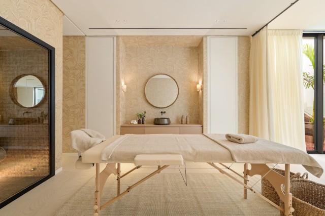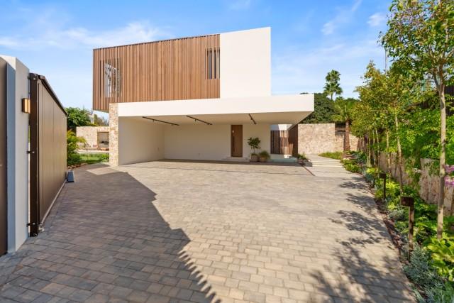 This is a masterpiece of contemporary architecture located in the prestigious Lomas de Marbella Club on Marbella’s Golden Mile. Built across 1,460 m² on a 1,010 m² plot, this 5-bedroom residence embodies a perfect balance between elegance, privacy, and Mediterranean serenity. Designed with wood and stone as its main elements, the home exudes an organic warmth - giving the inside a sense of green tranquility and the outside a calm, natural harmony. The layout of the villa is delicately planned, seamlessly dividing spaces for both privacy and social living. Upon entering, you are greeted by a generous open-plan living room and dining area, complemented by a light-wood kitchen that overlooks the social heart of the home. Floor-to-ceiling glass doors open to expansive terraces and a landscaped garden, inviting natural light and the outdoors in. This level also offers a private guest suite with its own terrace access, ensuring comfort and independence for visitors. Upstairs, three serene bedrooms include two guest suites opening onto the terrace, and a master suite featuring a walk-in closet and a luxurious bathroom with a rain shower and bathtub. The lower level of this magnificent home is dedicated to wellness and relaxation. Here, you can unwind in the spa and hammam, stay active in the home gym, enjoy a glass of wine in the wine room, or focus in your private home office. This floor also includes a playroom and an additional en-suite guest bedroom with direct access to the garden and pool area. Outside, manicured gardens frame a private pool, outdoor lounge, dining area, and fully equipped kitchen, creating the ideal setting for alfresco living. This modern home is the embodiment of refined design and calm sophistication—a sanctuary where nature, architecture, and lifestyle coexist in perfect balance.