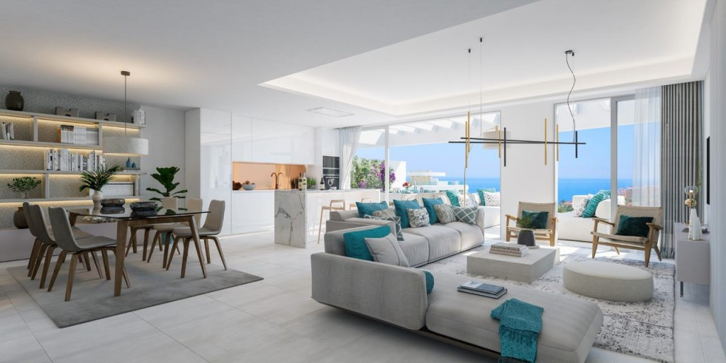 Setting: Close To Golf, Close To Shops, Close To Sea, Close To Schools Orientation: South Pool: Communal Climate Control: Hot A/C Views: Sea, Mountain, Pool Features: Fitted Wardrobes, Ensuite Bathroom Kitchen: Fully Fitted Garden: Communal Security: 24 Hour Security Category: New Development
