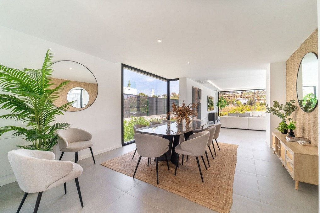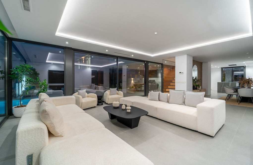 Set directly on the fairways of El Campanario Golf, this newly built villa delivers a refined residential experience just minutes from Puerto Banús, golden beaches, and some of the Costa del Sol’s most prestigious golf courses. Positioned within a highly sought-after residential enclave, the property offers privacy, architectural clarity, and seamless indoor–outdoor living. Built across 358 sqm on a 518 sqm plot, the villa has been thoughtfully designed to maximize natural light, spatial flow, and contemporary comfort. The home features five generous bedrooms, four with en-suite bathrooms, plus a guest toilet. Two exceptional primary suites include private rooftop terraces and walk-in wardrobes, creating elevated spaces that feel both intimate and luxurious. At the center of the home, a sophisticated open-plan living area connects effortlessly to the landscaped garden through expansive glass doors. Outside, a heated infinity-edge pool, alfresco dining area, and state-of-the-art BBQ set the stage for relaxed Mediterranean living and stylish entertaining. The lower level transforms the property into a private leisure retreat, complete with a cinema room, games area, gym, and additional bedrooms — ideal for hosting guests while maintaining complete comfort and independence. Overlooking tranquil golf scenery, the outdoor spaces invite year-round enjoyment — from sun-soaked afternoons to elegant evenings under the stars. A private garage and extensive parking further enhance everyday convenience. This is more than a home — it is a carefully curated lifestyle property designed for buyers who prioritize location, design, and long-term value on the Costa del Sol.